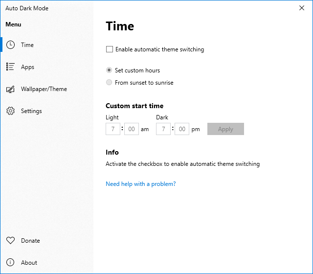 If you’re like me you don’t like bright whites on applications burning your eyes while using your PC in the later hours and you also like to have a bright screen during the day when the sun is shining. Windows does have a dark and light theme, but they do not switch automatically, meaning you will have to go into settings and do it yourself.